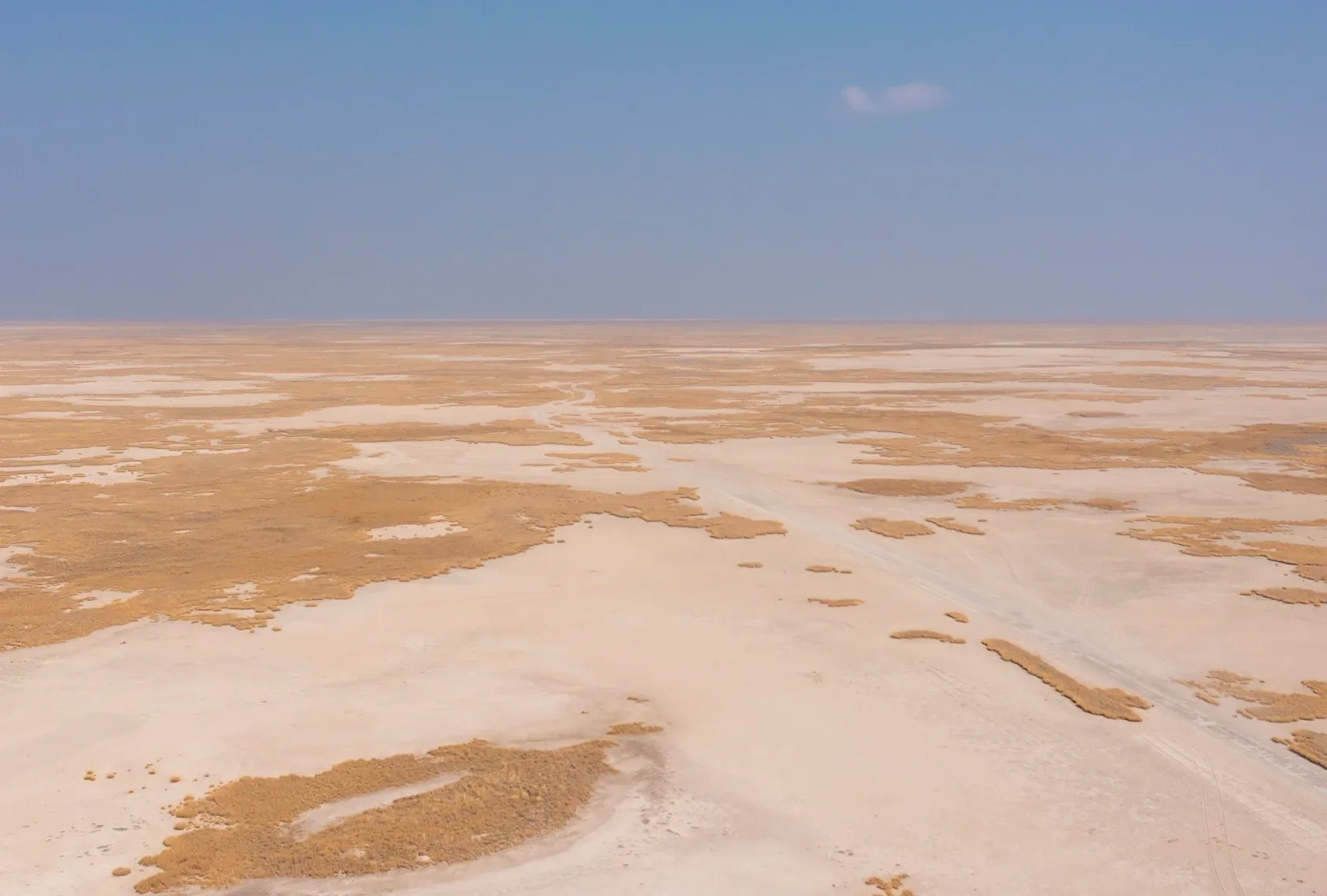 An endless white horizon where earth and sky dissolve — the Makgadikgadi Pans are pure, shimmering magnificence.